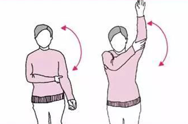 乳腺癌术后,患侧上肢由于受到手术的影响,可能会出现不同程度的功能障碍,如上举受限。因此,患者应尽早进行术后的康复功能锻炼。1.术后1~3天,活动患侧手指及腕部,可做简单的伸指、握拳、屈腕锻炼。2.术后3~10天:健侧手托住患侧肘部,行坐位屈肘;可用三角巾或吊带固定患肢,限制肩关节外展活动;禁止患侧肢体用力撑床,拆线前禁止患侧肢体上臂外展,只能在纱布约束范围内活动,拆线后循序渐进活动肢体。3.术后10~14天:患侧手摸同侧耳及对侧肩;可逐渐练习抬手内收活动。4.术后30天后:做肩部活动,锻炼抬高患侧上肢,将患侧的肘关节屈曲抬高,手掌置于对侧肩部。以肩关节为中心行前伸后伸运动,平臂摇摆。逐渐进行爬墙活动,练习抬高上肢:手指沿墙壁向上伸,以术前记录高度为目标,每天做好记录,每次尽量向上伸,伸到一定高度时停留3~5秒,再慢慢放下,直至患侧手指能高举过头,自行梳理头发。