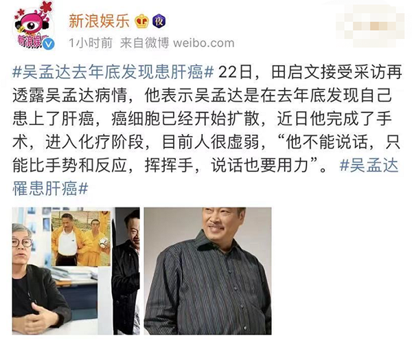 这则消息在吴孟达好友田启文口中得到了证实,他透露吴孟达在去年底发现自己患上了肝癌。
