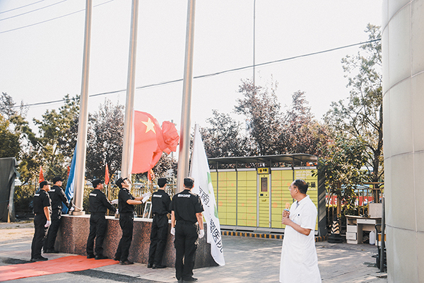 伴随着庄严的国歌声,旗手振臂一挥,鲜艳的五星红旗徐徐展开,在现场员工的注目下,鲜艳的五星红旗冉冉升起,迎风飘扬。围观的群众也纷纷驻足行注目礼,这一刻,民族的自豪感与爱国之情在每个人心中洋溢着,祝福伟大的祖国繁荣昌盛!