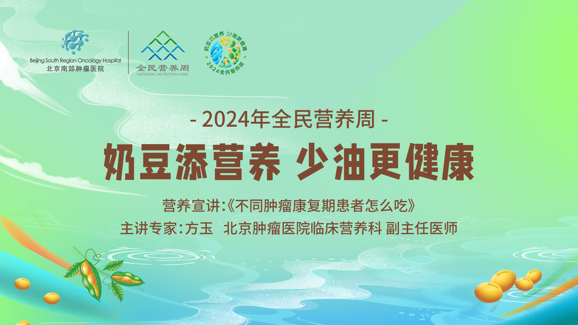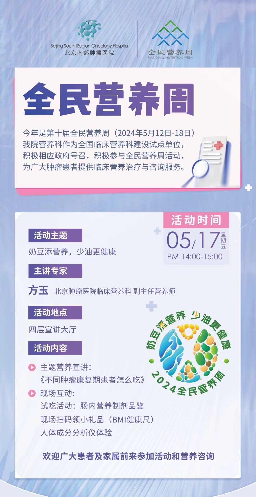 今年是第十届全民营养周(2024年5月12日-18日),北京南郊肿瘤临床营养科作为全国临床营养科建设试点单位,积极相应政府号召,积极参与全民营养周活动,为广大肿瘤患者提供临床营养治疗与咨询服务。今年全民营养周的活动主题是:奶豆添营养,少油更健康。旨在呼吁大众多吃大豆和奶类食品,同时减少烹调油的摄入量,倡导践行“健康中国 营养先行”的理念。