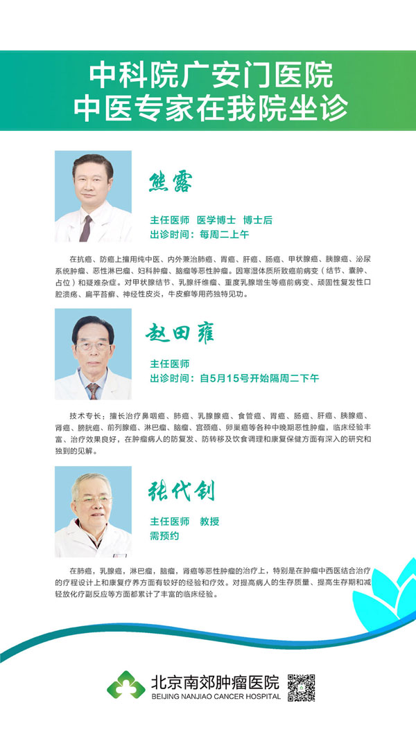 【通知】广安门医院三位中医专家5月起将在我院坐诊